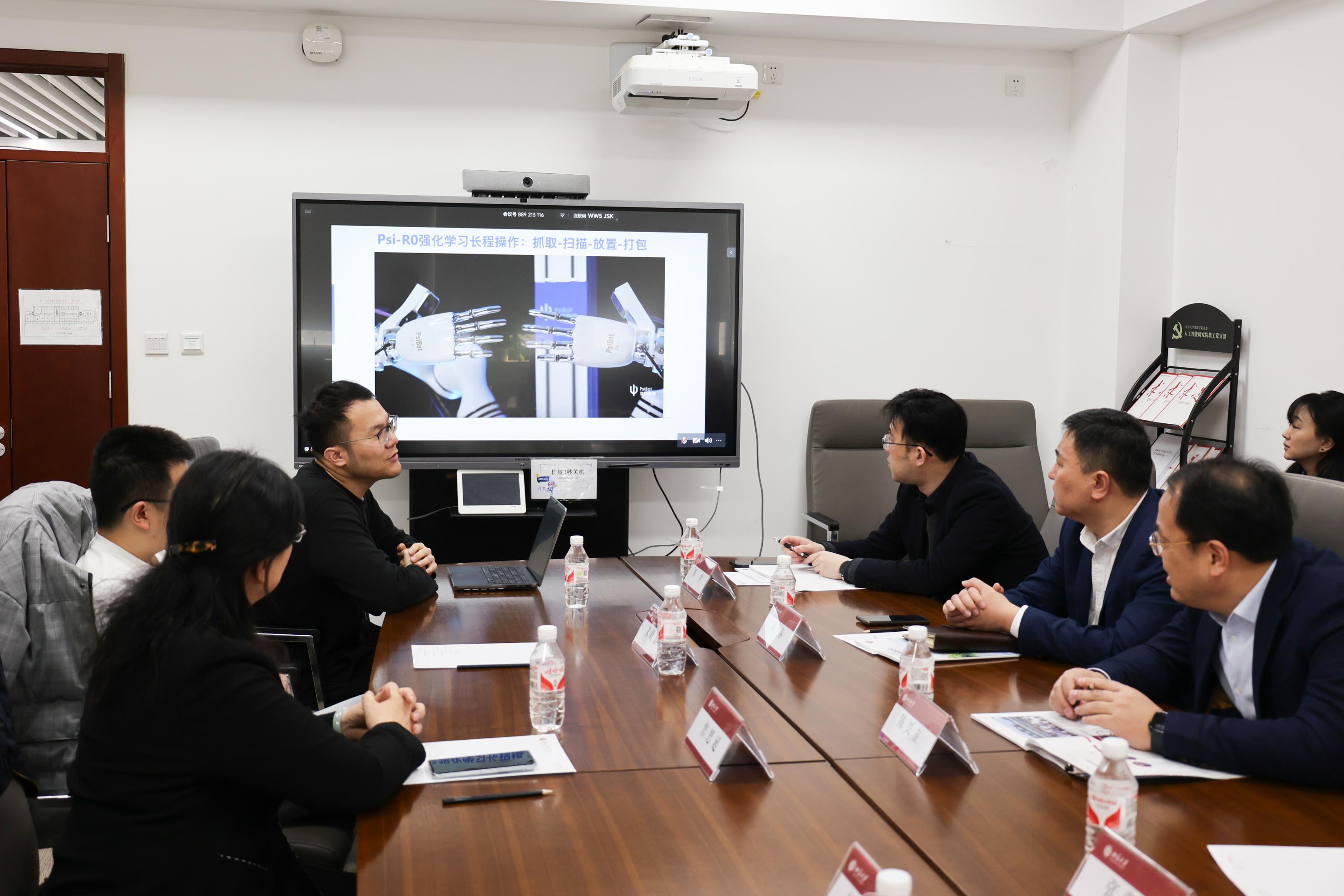 活动伊始,鄞州区代表团一行在北大代表团的陪同下参观了北京大学人工智能研究院。人工智能研究院教职工党支部书记杨耀东研究员和院长助理朱毅鑫研究员为代表团介绍了研究院在医疗健康领域的前沿应用与创新成果,并表达了与鄞州区在数智健康领域开展深度合作的期待。
