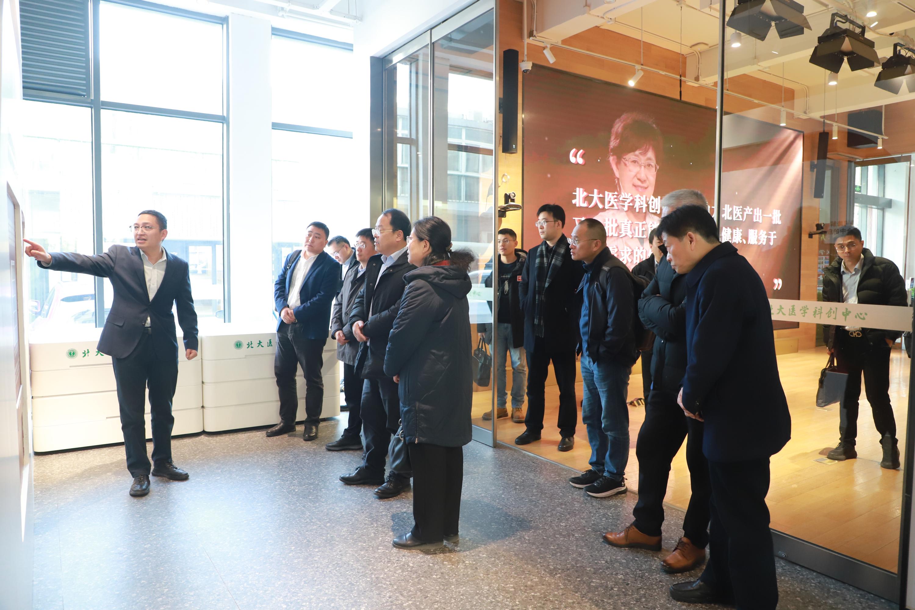 随后,代表团前往北大医学部参观了北大医学科创中心。产业管理办公室/技术转移办公室邱祥玉老师向代表团介绍北大医学转化大赛获奖成果,展现了北大医学在推动科研成果走向临床应用、助力健康产业发展方面的积极探索与显著成效。