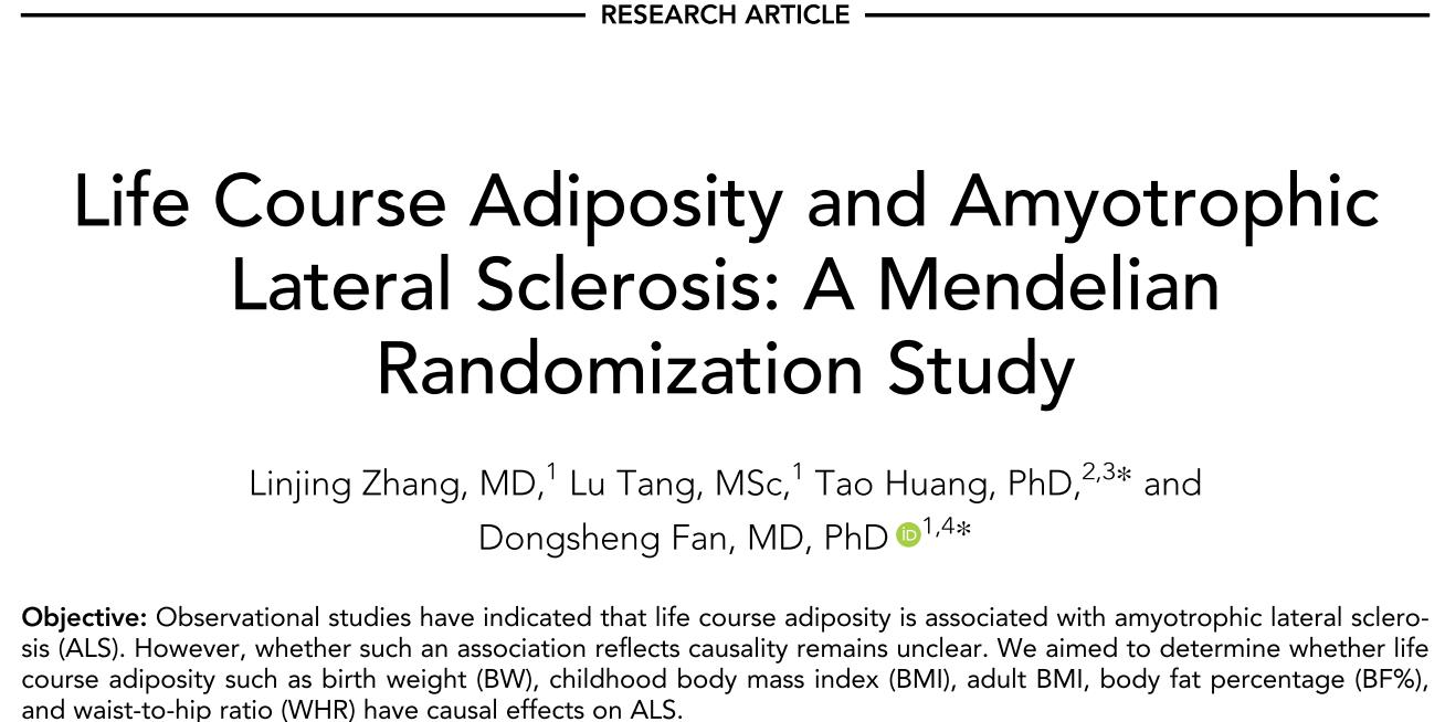 流行病与卫生统计学系黄涛博士合作发表有关渐冻症的病因学研究成果。肌萎缩侧索硬化(amyotrophic lateral sclerosis, ALS),又称渐冻症,是累及脊髓前角细胞、脑干运动神经核及锥体束的神经系统变性疾病,表现为进行性加重的肌肉无力、萎缩及锥体束征,多数患者在发病3~5年内死于呼吸衰竭。由于大部分ALS为散发性,多数找不到明确的致病基因,因此探究与发病有关的环境暴露因素对于肌萎缩侧索硬化的预防和干预至关重要。目前,ALS除运动神经元损害外,糖脂代谢紊乱对ALS的发生和预后发挥重要作用。