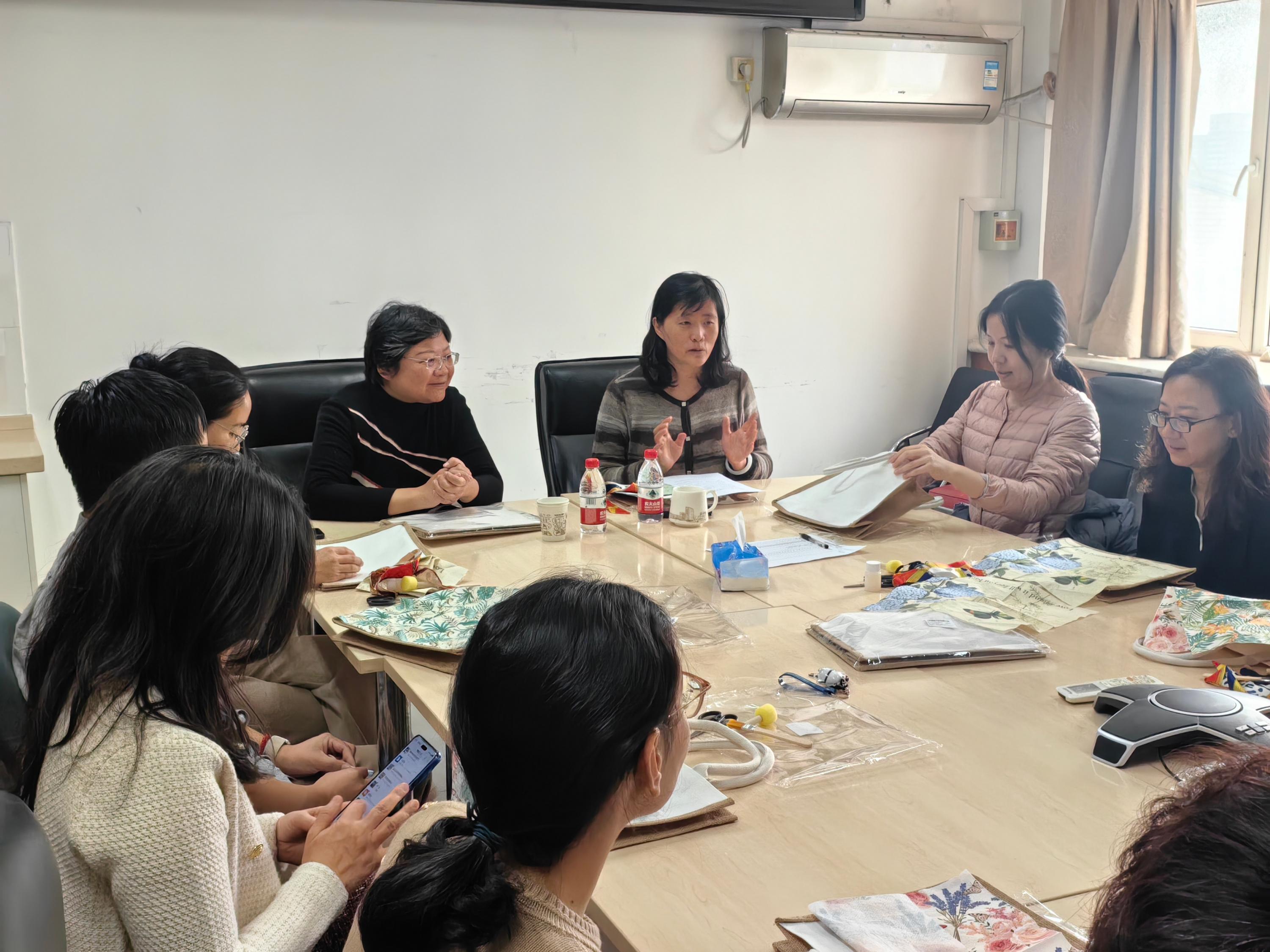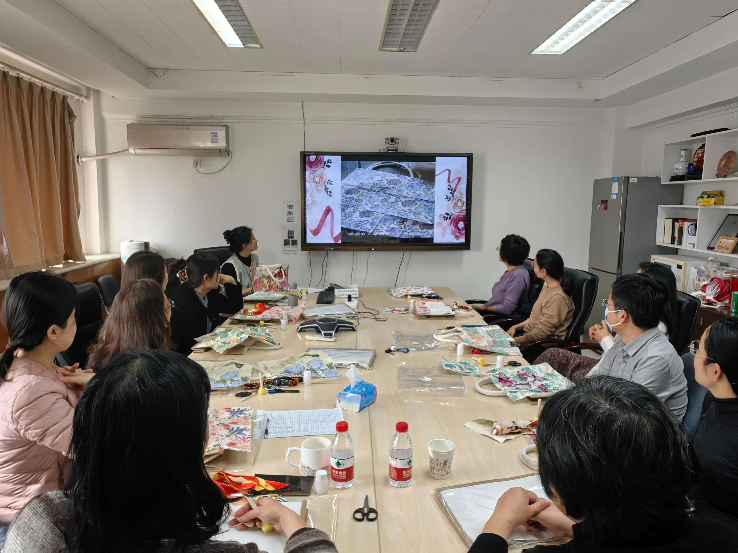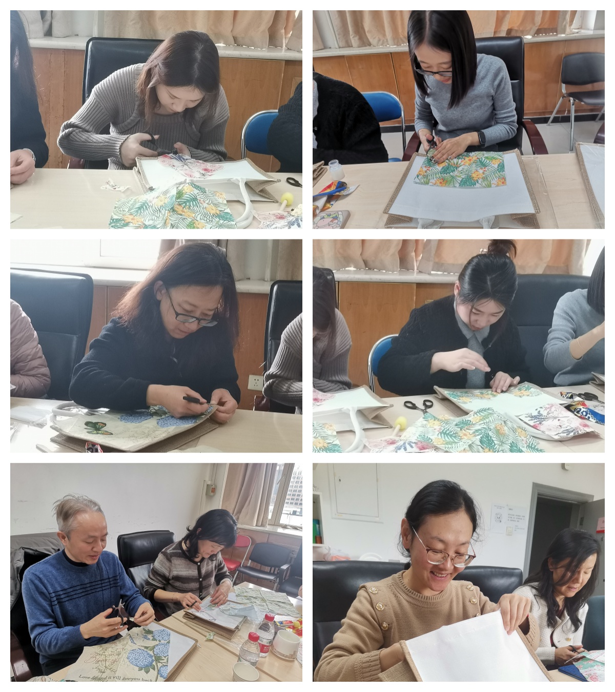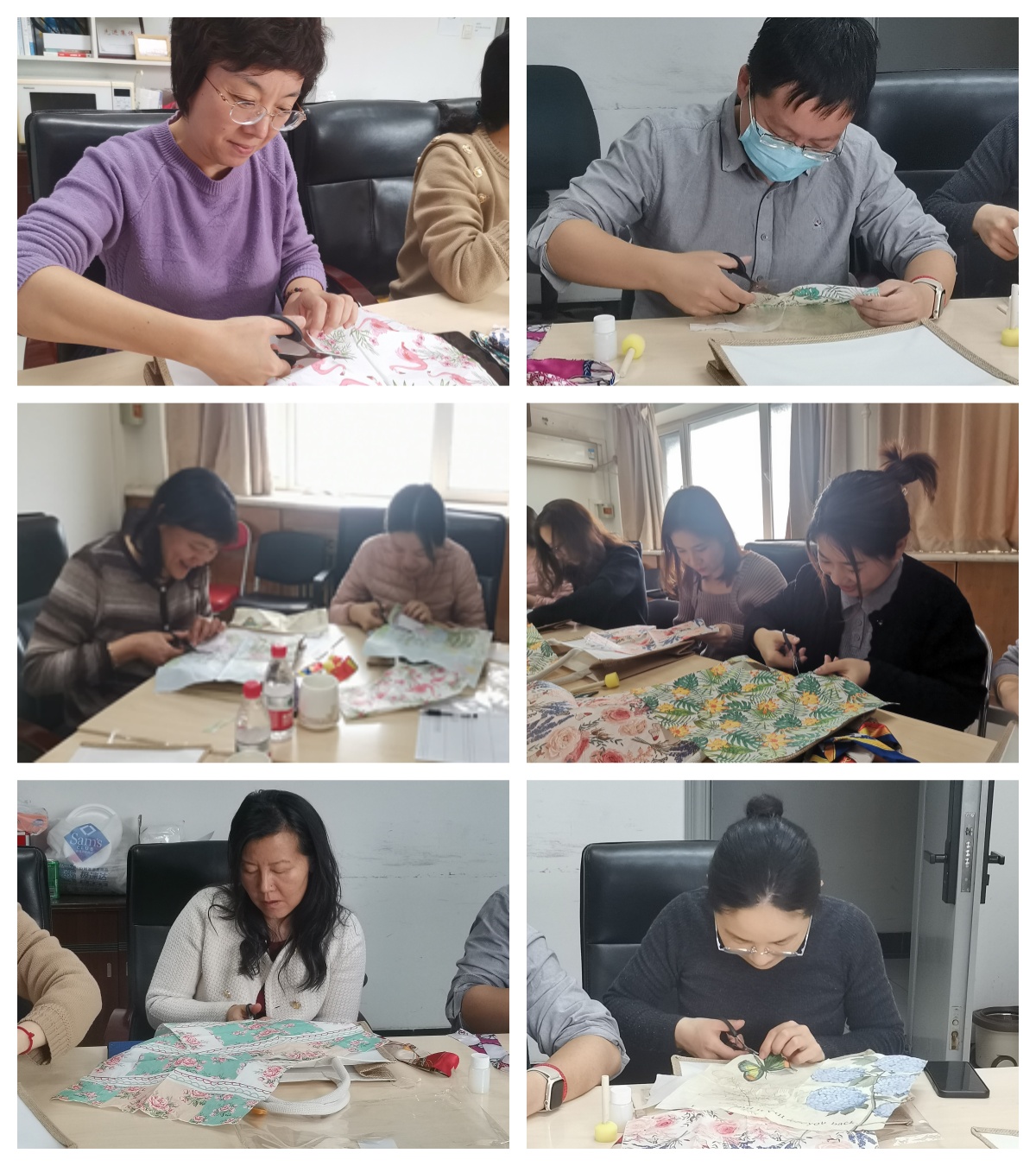 工会及学系领导一直以来对学系工会小组工作的支持表示衷心的感谢,同时祝福各位教师节日快乐。王佳老师介绍及演示了蝶骨巴特帆布包的由来及制作过程。蝶古巴特源自法国动词,意为将美丽图形剪裁,拼贴装饰于家居物品上,可以充分发挥自己的想象力,随意剪裁和粘贴,打造出独具特色的蝶古巴特包。