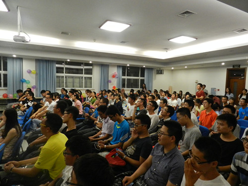 晚会从一段暖场视频中开始,随后一曲别样风格的《小苹果》点燃了会场气氛,载歌载舞的方式演绎着小苹果的温暖,这里既是迎新会也是联欢晚会,在和学弟学妹们的欢声笑语中拉近了彼此的距离。热情过后是一段学长学姐精心准备的大一生活寄语,简短的话语却又有道不完的深情,“燕园里,不管快乐的、不快乐的都将成为无价的回忆用以珍藏,一生回味。”视频之后便是精彩的晚会节目,一支轻柔又优雅的独舞于《女人花》中深情阐述着女人如花花似梦的情怀;一段跌宕起伏的近景魔术里上演着黑桃与梅花的奇幻邂逅;一台搞笑活泼的舞台剧中折射出“为伊消得人憔悴”的学习生活;一首柔情似水的英文独唱述说了大学里相遇相知的浪漫。同时,节目之间依次穿插了比划猜词、看谁反应快、有奖问答三个轻松小游戏,气氛十分活跃。